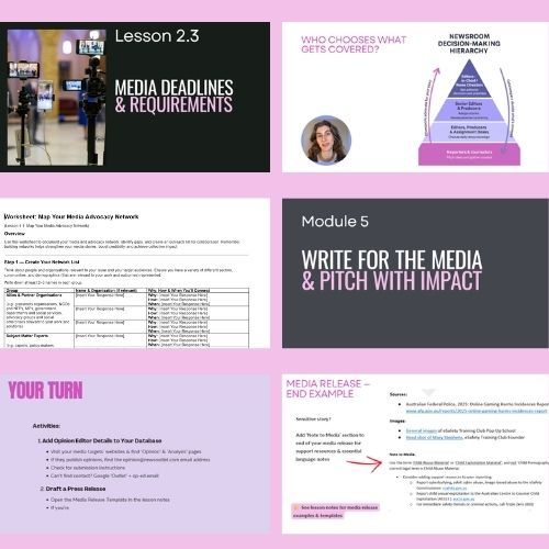 With group access to online PR and media advocacy training, your organisation can support multiple women leaders at once to build their confidence, skills, and strategic media know-how to attract media attention to their work and mission—in whatever area they're focused.